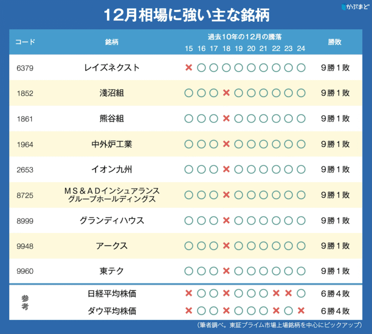 そんな12月相場で上昇しやすいのは、どんな銘柄でしょうか? 過去10年(2015年~2024年)の12月相場で勝率が高かった銘柄を見てみましょう。いずれも、「12月相場に強い銘柄」として相場ではおなじみの企業です。
