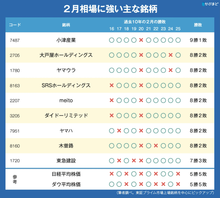 そんな2月相場で上昇しやすいのは、どんな銘柄でしょうか? 過去10年(2016年~2025年)の2月相場で勝率が高かった銘柄を見てみましょう。いずれも、「2月相場に強い銘柄」として相場ではおなじみの企業です。