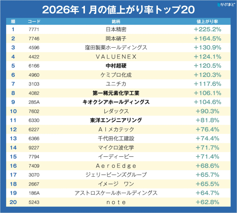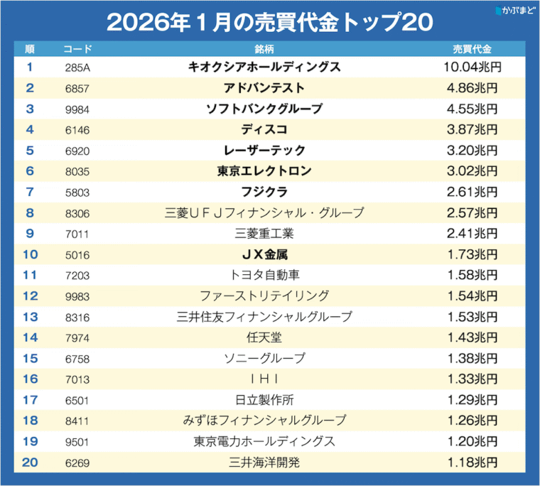そんな2026年1月の株式相場を売買代金と値上がり率・値下がり率のランキングで振り返ってみたいと思います(太字はピックアップ銘柄/データ提供:カブケーションズ)。