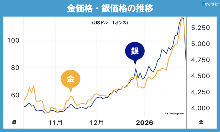 月末最終日には大きく下落しましたが、年末から大きく上昇してきています。その結果、関連銘柄も大きく上昇しました。産業として必要な素材という側面もありますが、トランプ政権によるドル安容認の姿勢もあり、特に「金」の価格が大きく上昇しました。