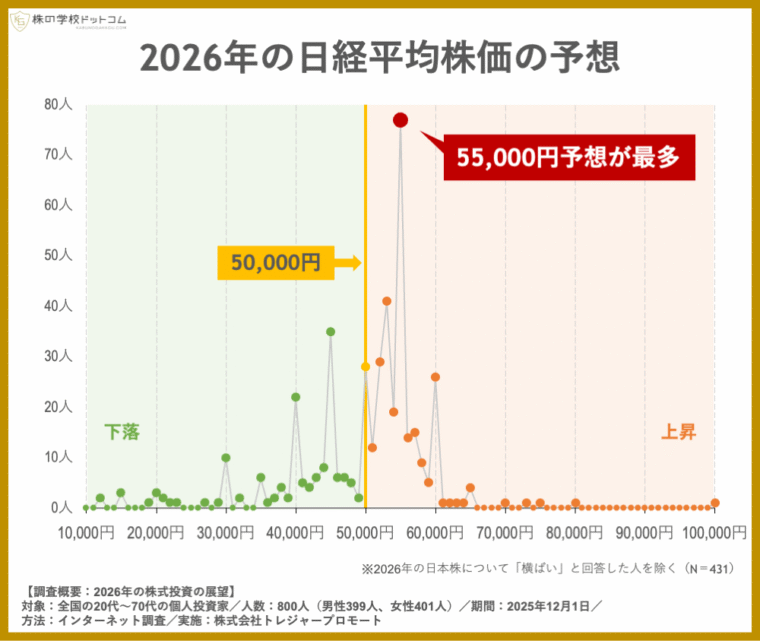 (参照)【2026年の株式市場】個人投資家の予想は「横ばい」が最多。上昇派は下落派の約2倍。日経平均「55,000円」予想が多い一方、プロは「それ以上の上昇ペース」も想定